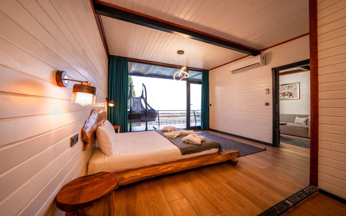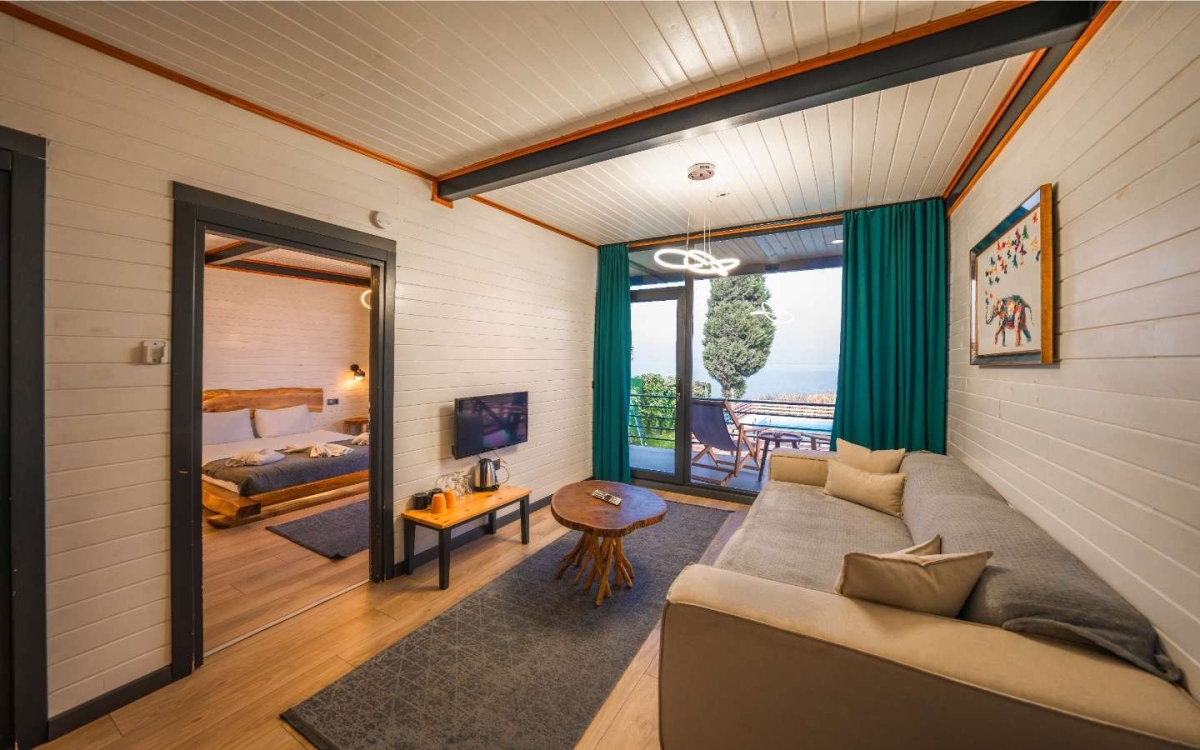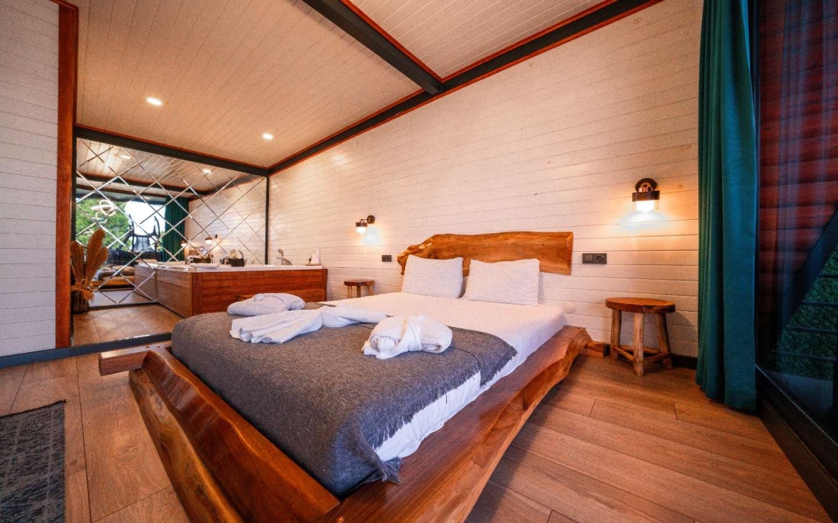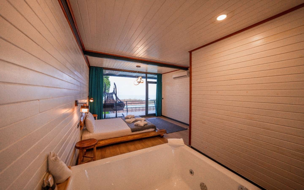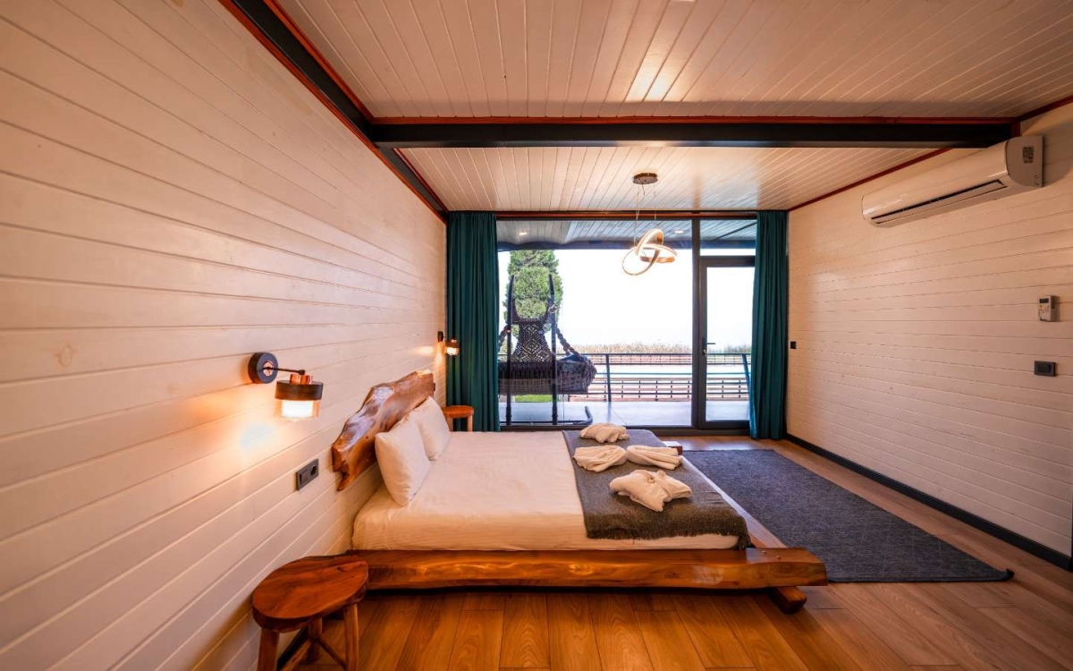 Göl manzaralı Jakuzili Delüxe Bungalov: Diğer bungalovlardan bağımsız olarak konumlandırılmış delüxe bungalovlarımız tek kat üzerine inşa edilmiş yüksek yapılardır. Direkt göl manzarası bulunan bu bungalovumuzda yatak odasında çift kişilik jakuzi mevcuttur. Hem yatak odasından hem oturma alanından erişimi olan balkon manzaranın ve sakinliğin tadını çıkarmanız için tasarlanmıştır. 2 kişilik kahvaltı dahil;